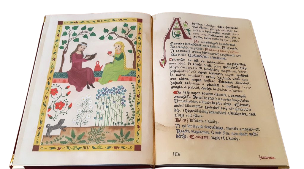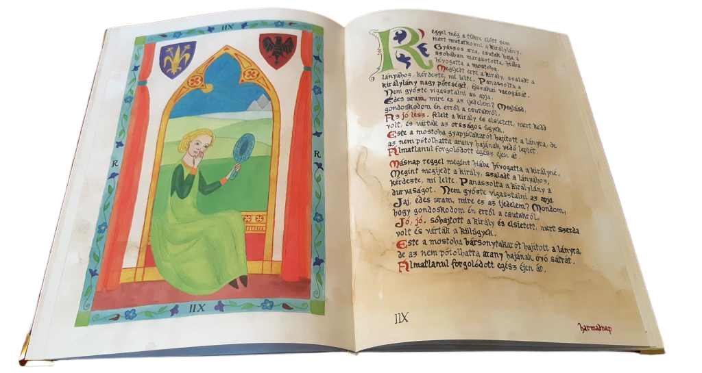 Az eredeti Aranyhaj mesekönyv hónapokon át készült kézzel írott, festett és aranyozott kódexként. Minden betű, díszítés és illusztráció az alkotók saját keze nyomát viseli. Ebből az eredeti óriás kódexből készült a digitális másolat, amely megőrzi a kézműves részletek minden szépségét – hogy a mű elérhető legyen a szélesebb közönség számára is.